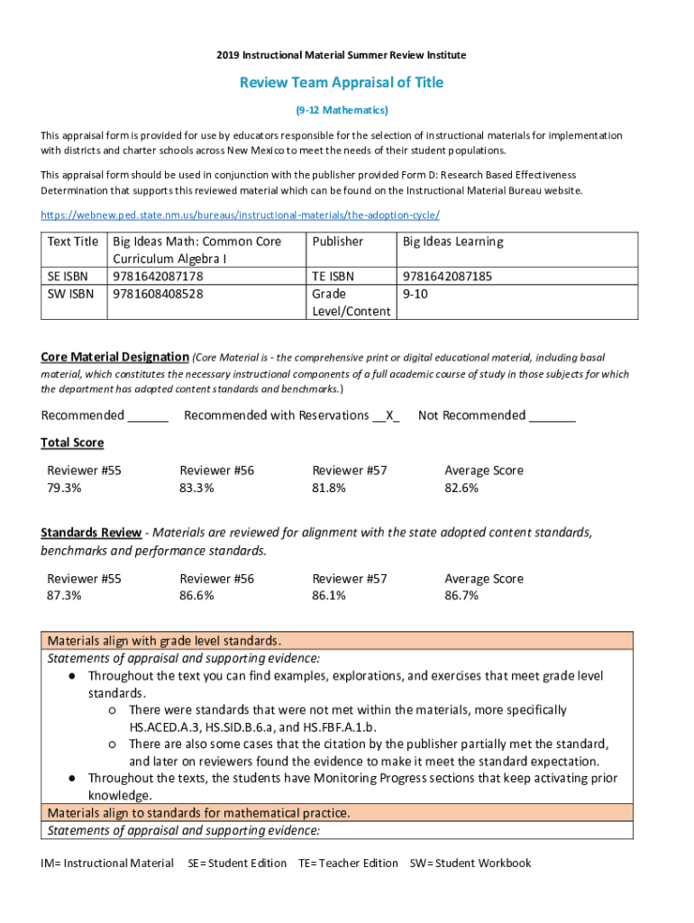 2019 Instructional Material Summer Review InstituteReview Team Appraisal of Title (912 Mathematics) This appraisal form is provided for use by educators responsible for the selection of instructional