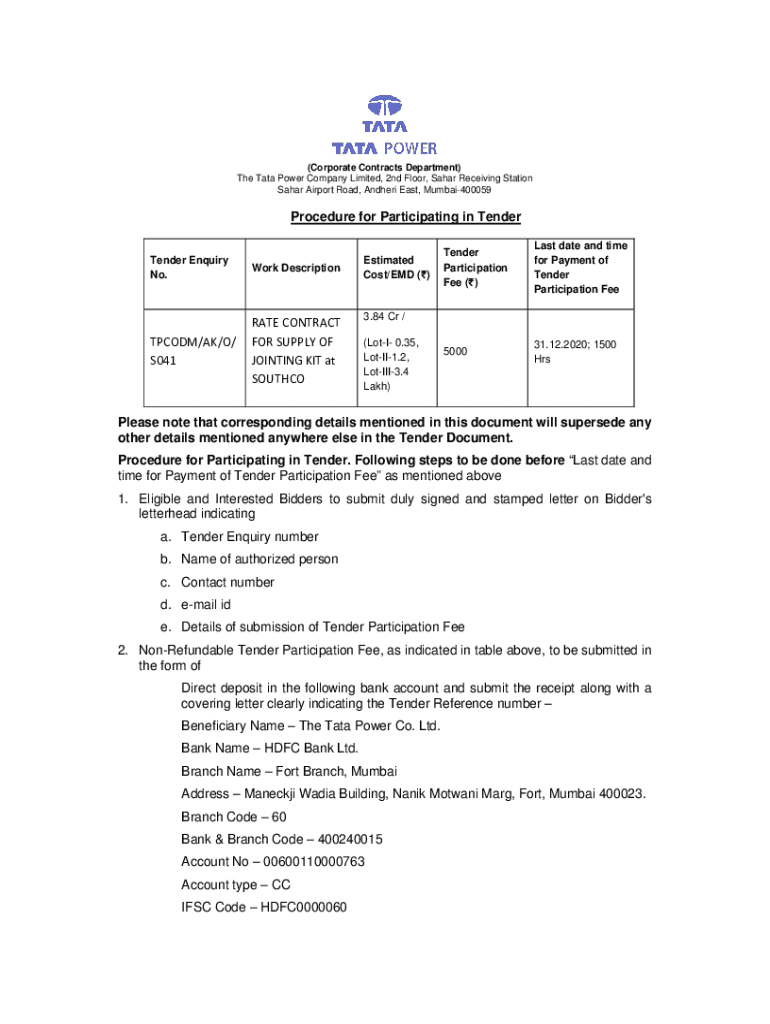 (Corporate Contracts Department) The Tata Power Company Limited, 2nd Floor, Sahar Receiving Station Sahar Airport Road, Andheri East, Mumbai400059Procedure for Participating in Tender Tender Enquiry