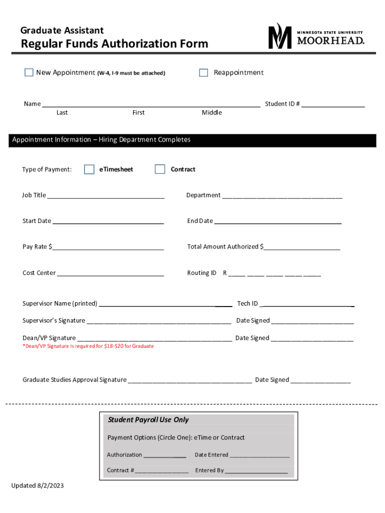 Get the free Graduate Assistant Regular Funds Authorization Form. Graduate student employee regul...