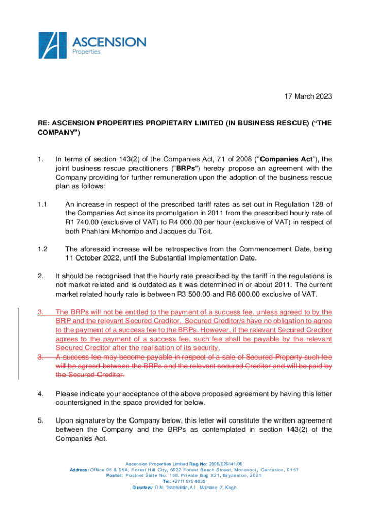 17 March 2023RE: ASCENSION PROPERTIES PROPRIETARY LIMITED (IN BUSINESS RESCUE) (THE COMPANY)1. In terms of section 143(2) of the Companies Act, 71 of 2008 (Companies Act), the joint business rescue