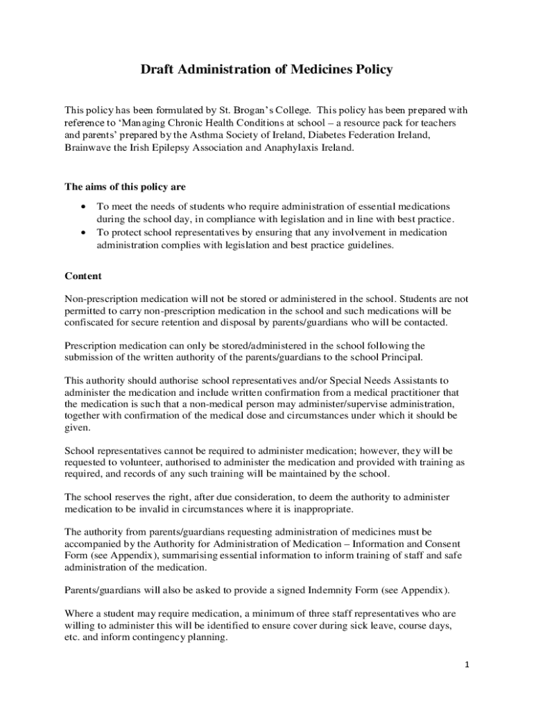 Draft Administration of Medicines Policy This policy has been formulated by St. Brogans College. This policy has been prepared with reference to Managing Chronic Health Conditions at school a resource