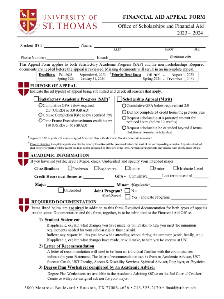 FINANCIAL AID APPEAL FORM Office of Scholarships and Financial Aid 2023 2024 Name:Student ID #:Email:Phone Number’M.I.FIRSTLAST@stthom.eduThis Appeal Form applies to both Satisfactory Academic Progress