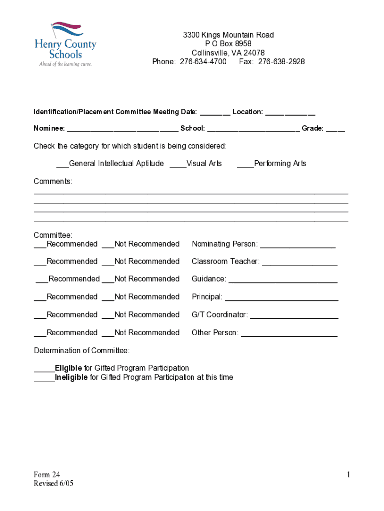 3300 Kings Mountain Road P O Box 8958 Collinsville, VA 24078 Phone: 2766344700 Fax: 2766382928Identification/Placement Committee Meeting Date: ___ Location: ___ Nominee: ___ School: ___ Grade: ___Check