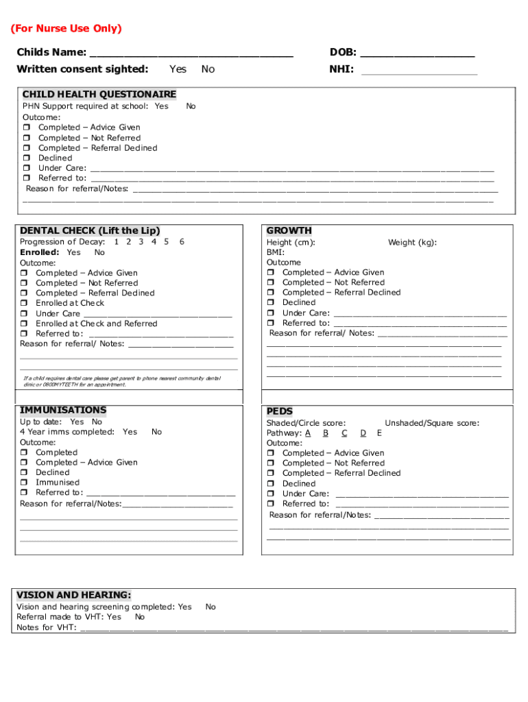 (For Nurse Use Only) Childs Name: ___DOB: ___Written consent sighted:NHI:YesNoCHILD HEALTH QUESTIONAIRE PHN Support required at school: Yes No Outcome: Completed Advice Given Completed Not Referred