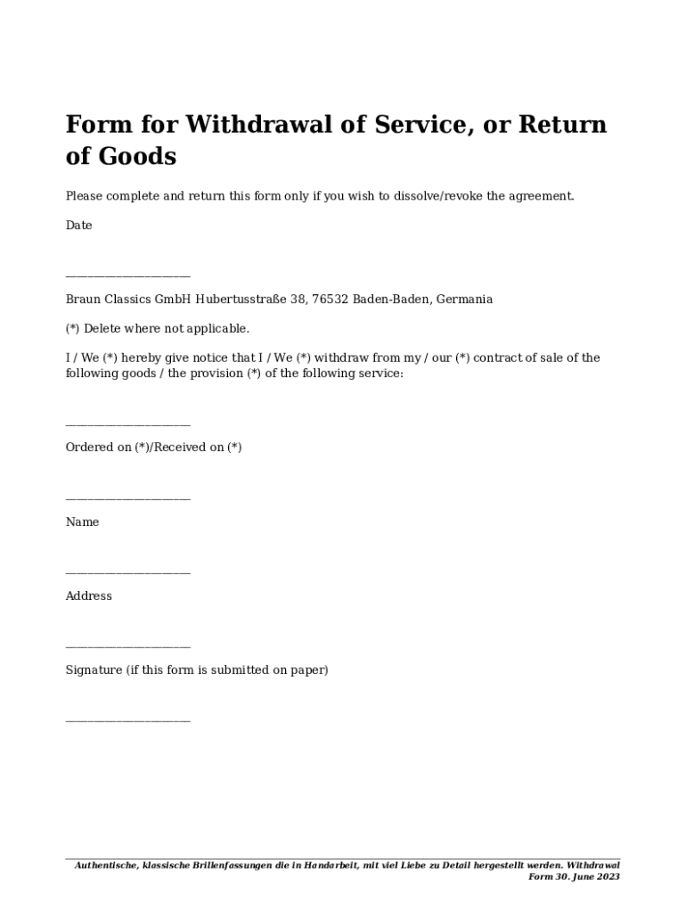 Form for Withdrawal of Service, or Return of Goods Please complete and return this form only if you wish to dissolve/revoke the agreement. Date___ Braun Classics GmbH Hubertusstrae 38, 76532 BadenBaden,