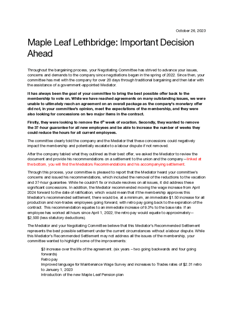 October 26, 2023Maple Leaf Lethbridge: Important Decision Ahead Throughout the bargaining process, your Negotiating Committee has strived to advance your issues, concerns and demands to the company