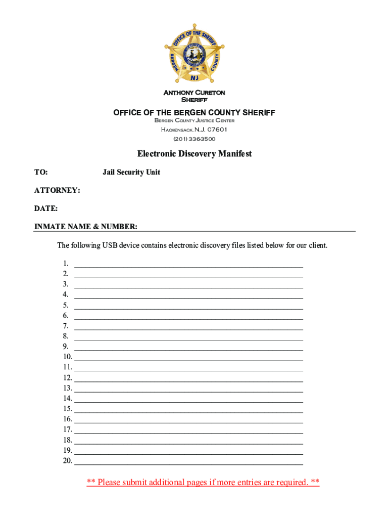 Anthony Cureton SheriffOFFICE OF THE BERGEN COUNTY SHERIFF BERGEN COUNTY JUSTICE CENTER HACKENSACK, N.J. 07601 (201) 3363500Electronic Discovery Manifest TO:Jail Security UnitATTORNEY: DATE: INMATE