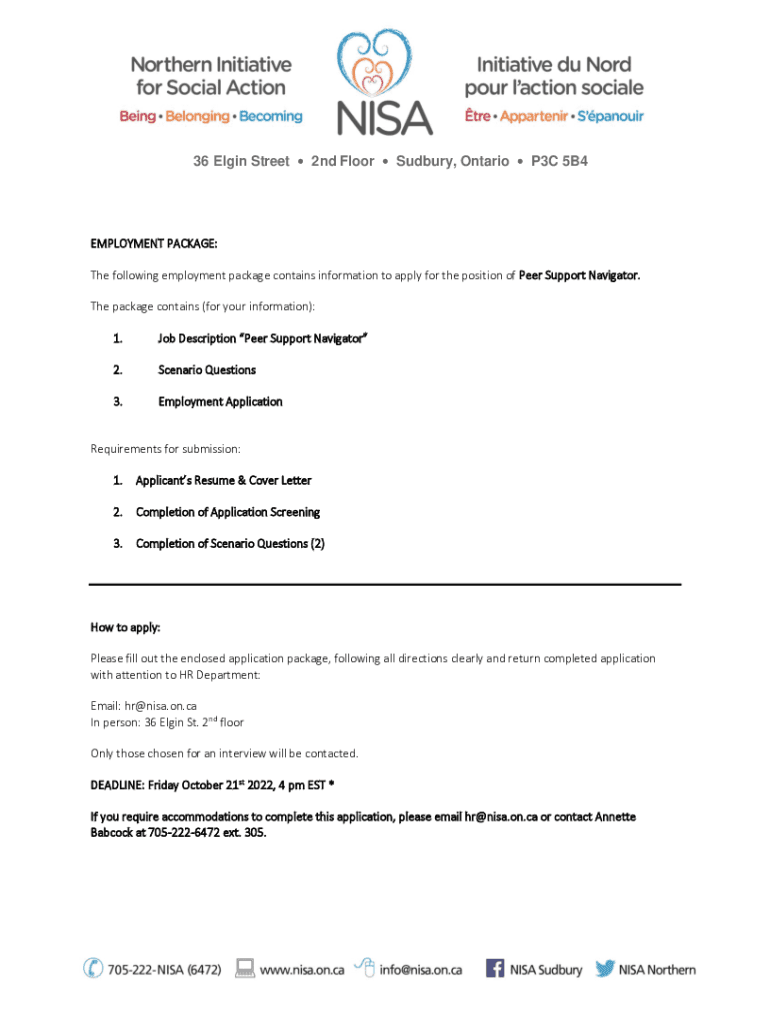 36 Elgin Street 2nd Floor Sudbury, Ontario P3C 5B4EMPLOYMENT PACKAGE: The following employment package contains information to apply for the position of Peer Support Navigator. The package contains