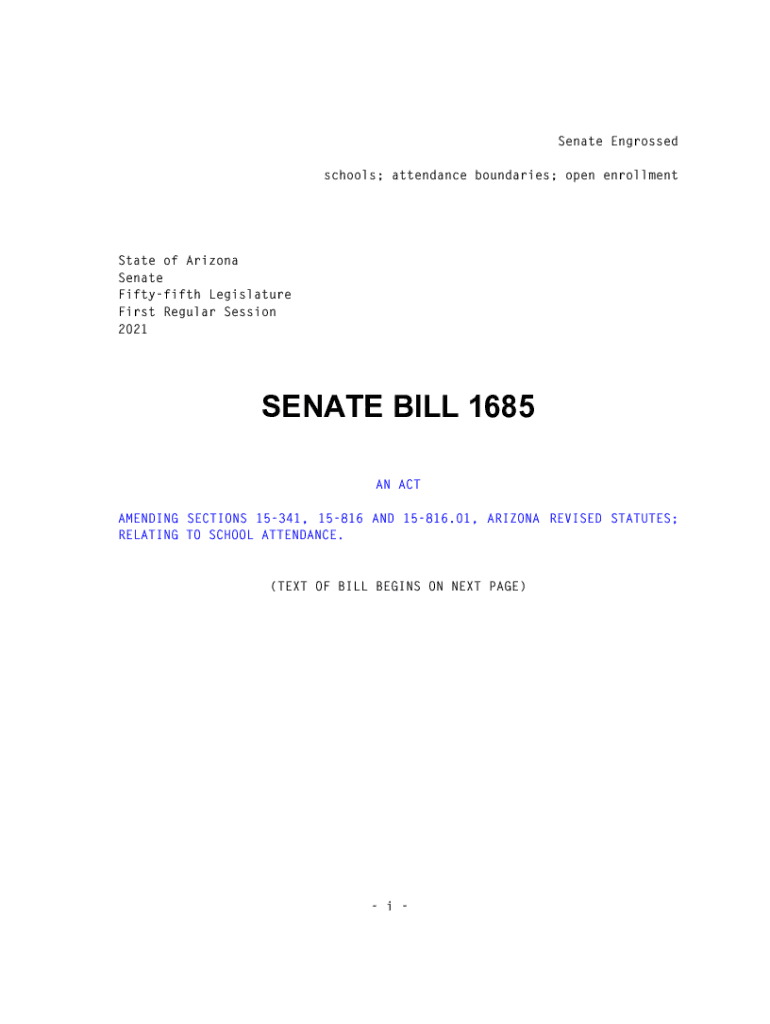 Senate Engrossed schools; attendance boundaries; open enrollmentState of Arizona Senate Fifty fifth Legislature First Regular Session 2021SENATE BILL 1685 AN ACT AMENDING SECTIONS 15341, 15816 AND