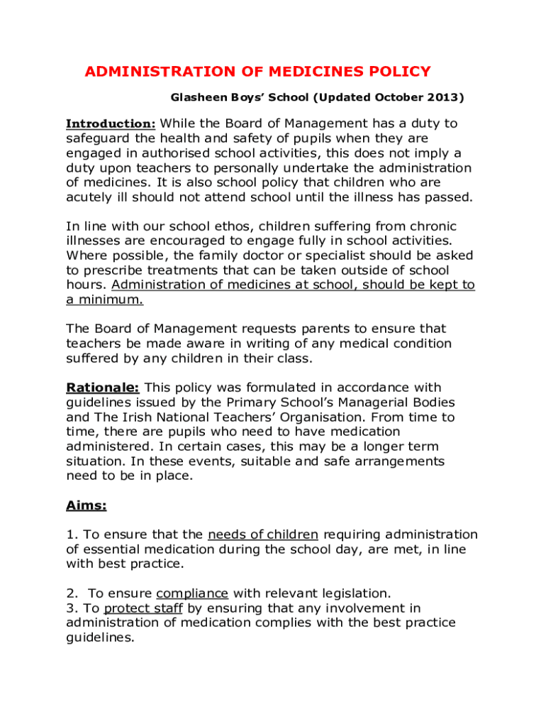 ADMINISTRATION OF MEDICINES POLICY Glassmen Boys School (Updated October 2013)Introduction: While the Board of Management has a duty to safeguard the health and safety of pupils when they are engaged