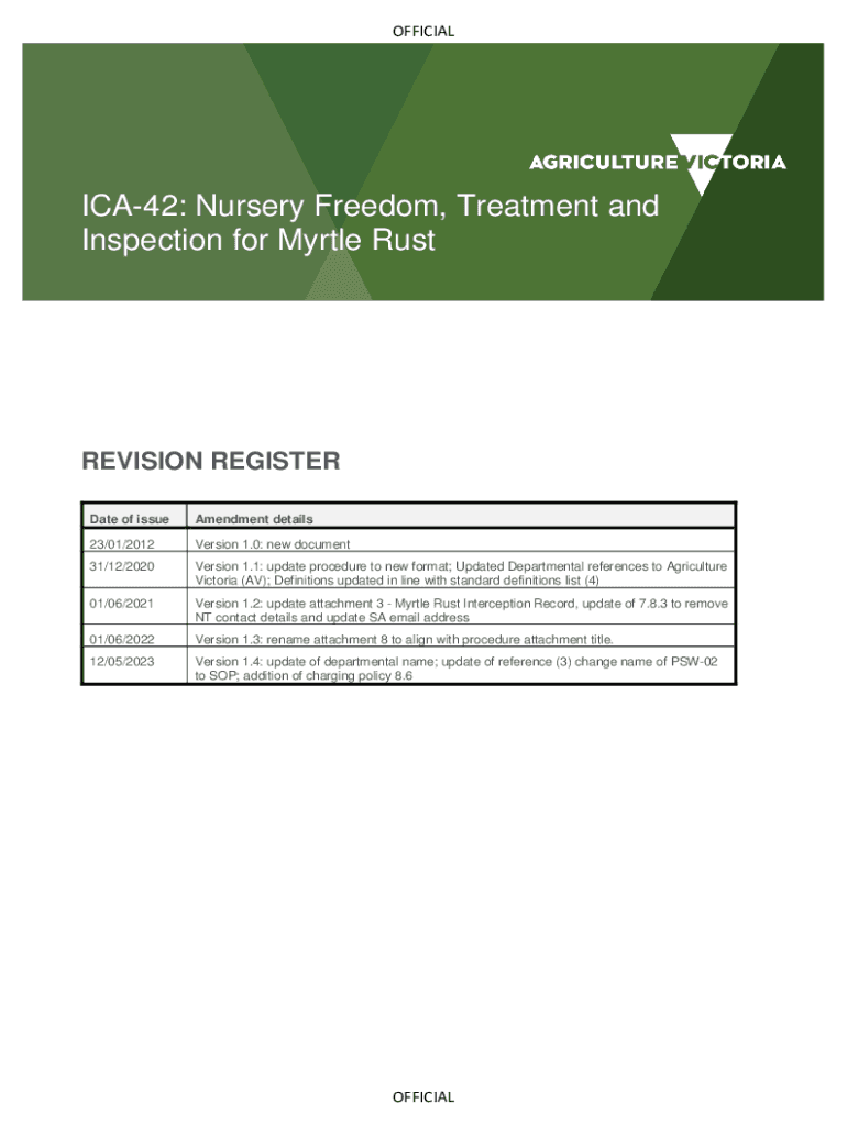 OFFICIALICA42: Nursery Freedom, Treatment and Inspection for Myrtle RustREVISION REGISTER Date of issueAmendment details23/01/2012Version 1.0: new document31/12/2020Version 1.1: update procedure to