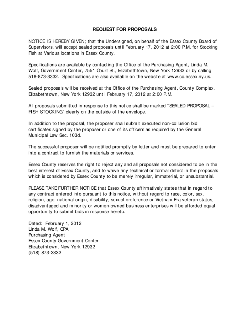 REQUEST FOR PROPOSALS NOTICE IS HEREBY GIVEN; that the Undersigned, on behalf of the Essex County Board of Supervisors, will accept sealed proposals until February 17, 2012, at 2:00 P.M. for Stocking