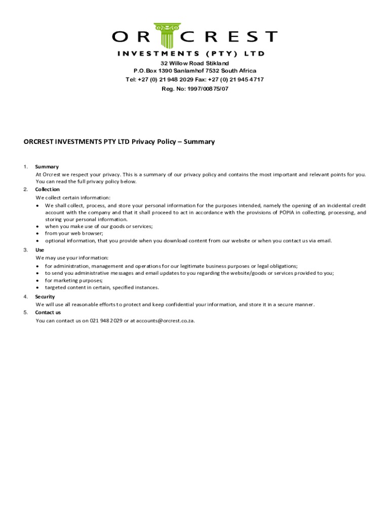 Reg. No: 1997/00875/07ORCREST INVESTMENTS PTY LTD Privacy Policy Summary1.2. Summary