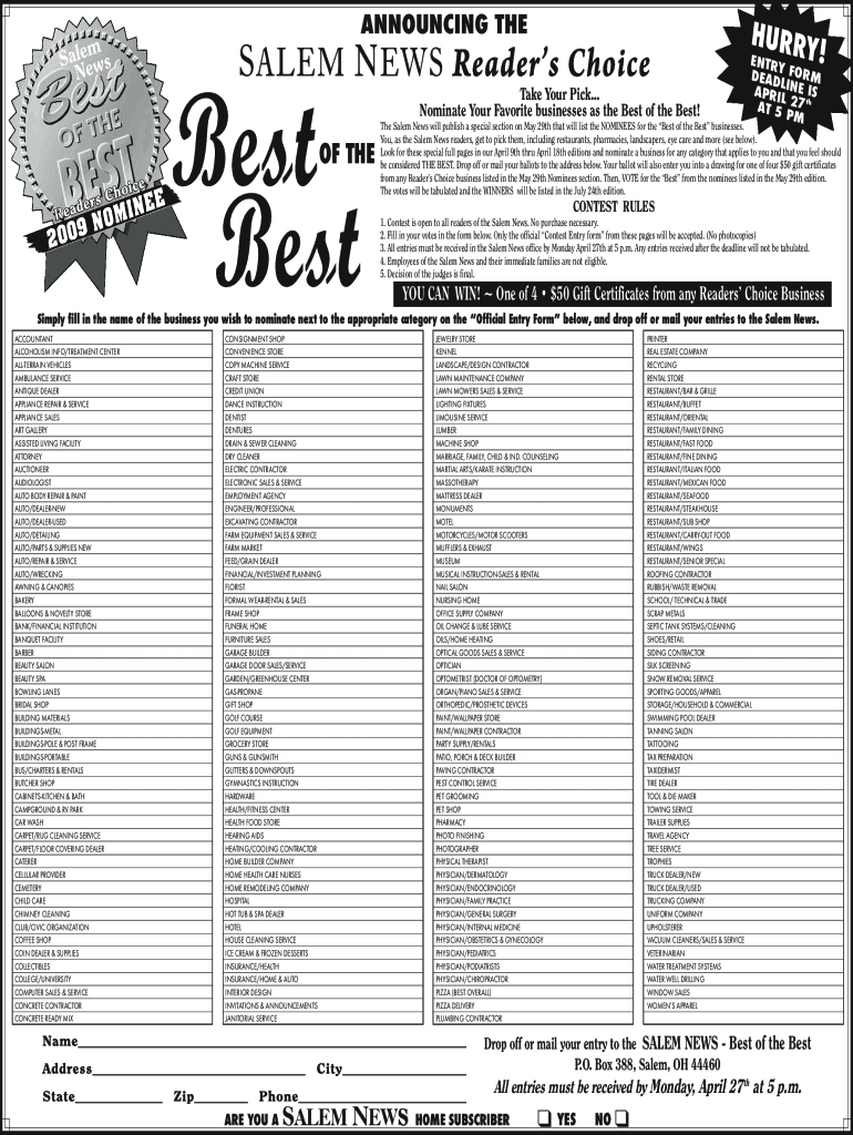 ANNOUNCING THES ALEM N EWS R ea ders C h oiceBest BestOF THETake Your Pick... Nominate Your Favorite businesses as the Best of the Best!HURRY!ENTRY DEAD FORM L APRILINE IS t AT 5 27 h PMThe Salem