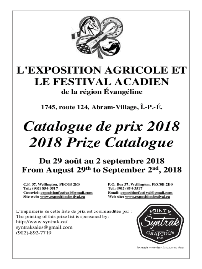 L\'EXPOSITION AGRICOLE ET LE FESTIVAL ACADIEN de la rgion vangline 1745, route 124, AbramVillage, .P..Catalogue de prix 2018 2018 Prize Catalogue Du 29 aot au 2 septembre 2018 From August 29th to