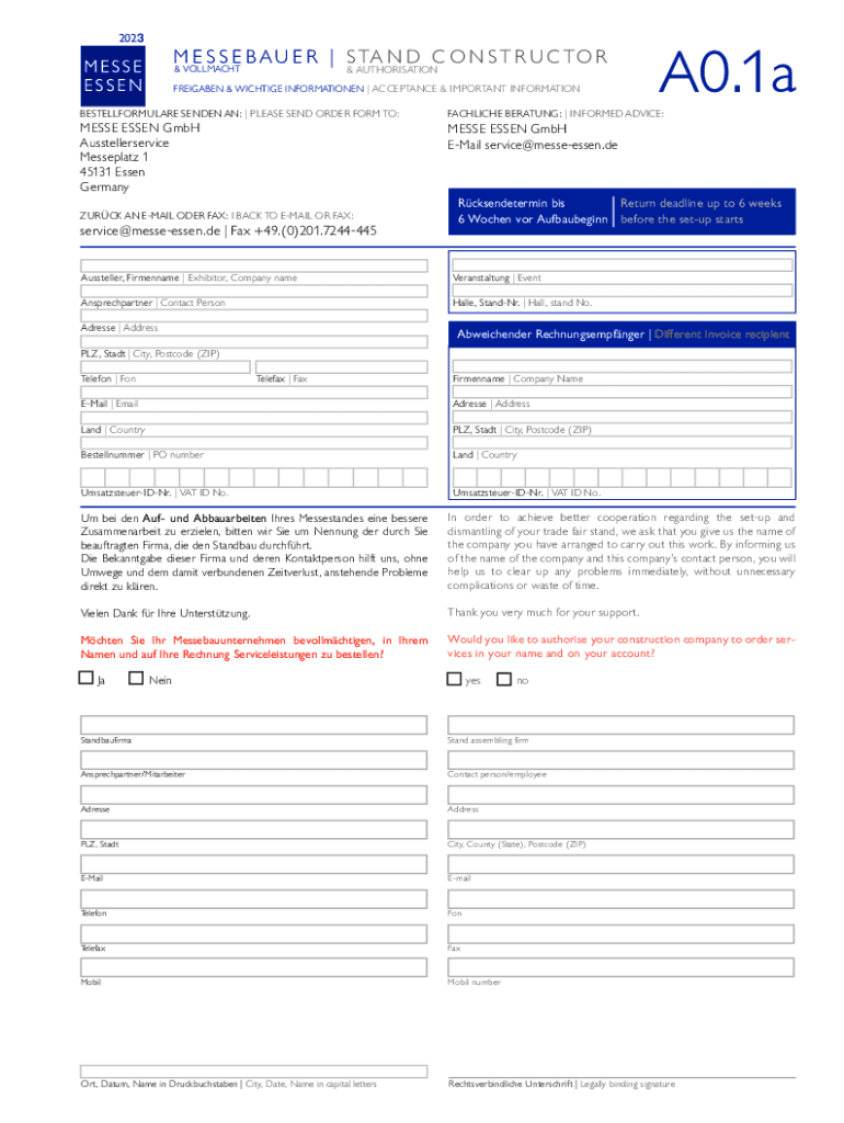 2023M E S S E B A U E R | S TA N D C O N S T R U C TO R & AUTHORISATION& VOLLMACHTFREIGABEN & WICHTIGE INFORMATIONEN | ACCEPTANCE & IMPORTANT INFORMATIONA0.1aBESTELLFORMULARE SENDEN AN: | PLEASE SEND