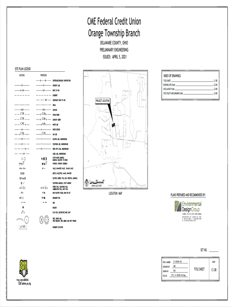 CME Federal Credit Union Orange Township Branch DELAWARE COUNTY, OHIO PRELIMINARY ENGINEERING ISSUED: APRIL 5, 2021, SITE PLAN LEGEND EXISTINGPROPOSEDINDEX OF DRAWINGS TITLE SHEETC1.00EXISTING SITE