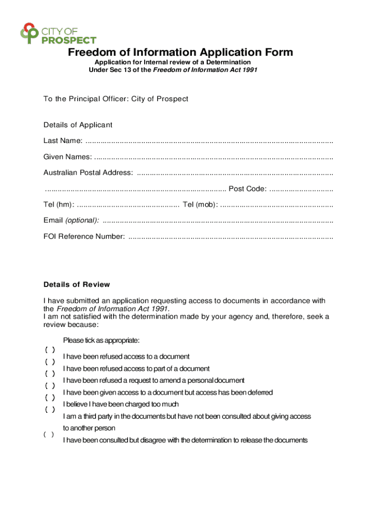 Freedom of Information Application Form Application for Internal review of a Determination Under Sec 13 of the Freedom of Information Act 1991To the Principal Officer: City of ProspectDetails of Applicant