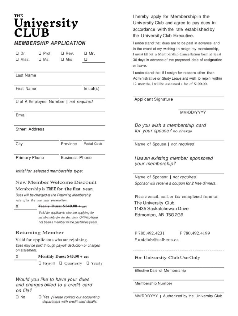I hereby apply for Membership in the University Club and agree to pay dues in accordance with the rate established by the University Club Executive.MEMBERSHIP APPLICATIONI understand that dues are