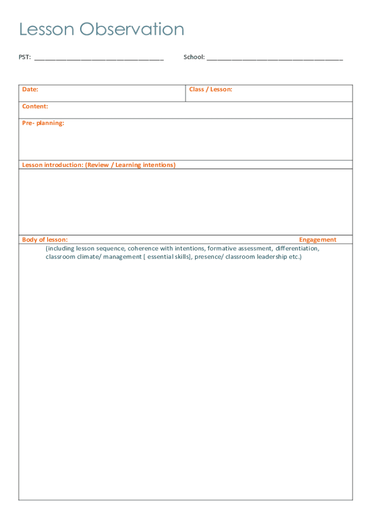 Lesson Observation PST: ___Date:School: ___Class / Lesson:Content: PRE planning:Lesson introduction: (Review / Learning intentions)Body of lesson: Engagement (including lesson sequence, coherence
