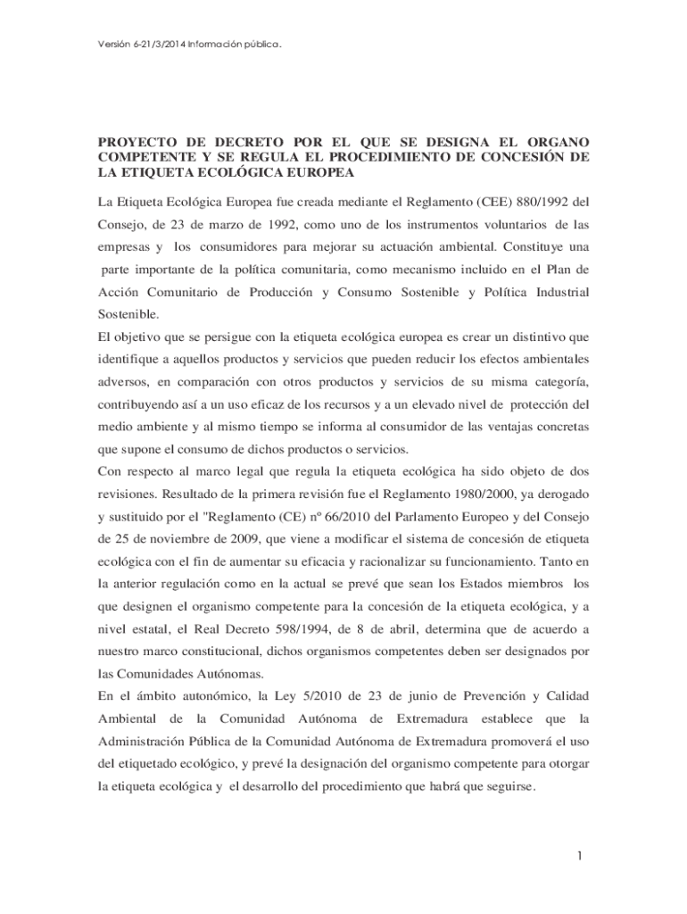 Versin 621/3/2014 Informacin pblica.PROYECTO DE DECRETO POR EL QUE SE DESIGNA EL ORGANO COMPETENTE Y SE REGULA EL PROCEDIMIENTO DE CONCESIN DE LA ETIQUETA ECOLGICA EUROPEA La Etiqueta Ecolgica Europea
