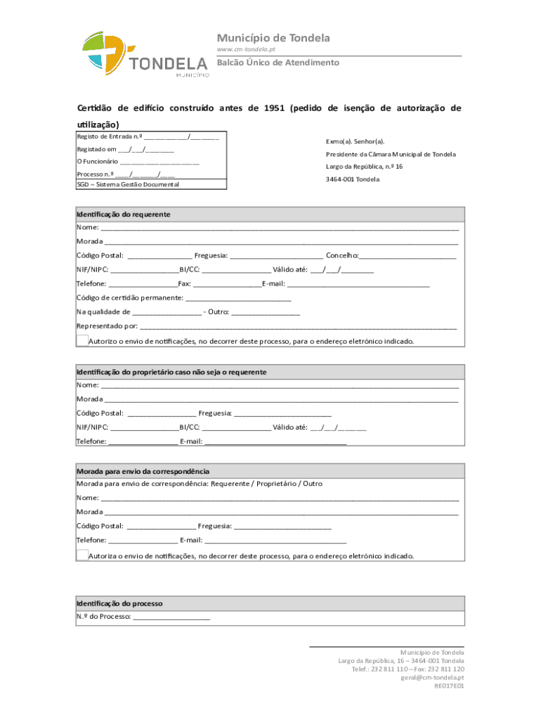 Municpio de Tondela www.cmtondela.ptBalco nico de AtendimentoCertido de edifcio construdo antes de 1951 (pedido de iseno de autorizao de utilizao) Registo de Entrada n. ___/___ Registado em ___/___/___