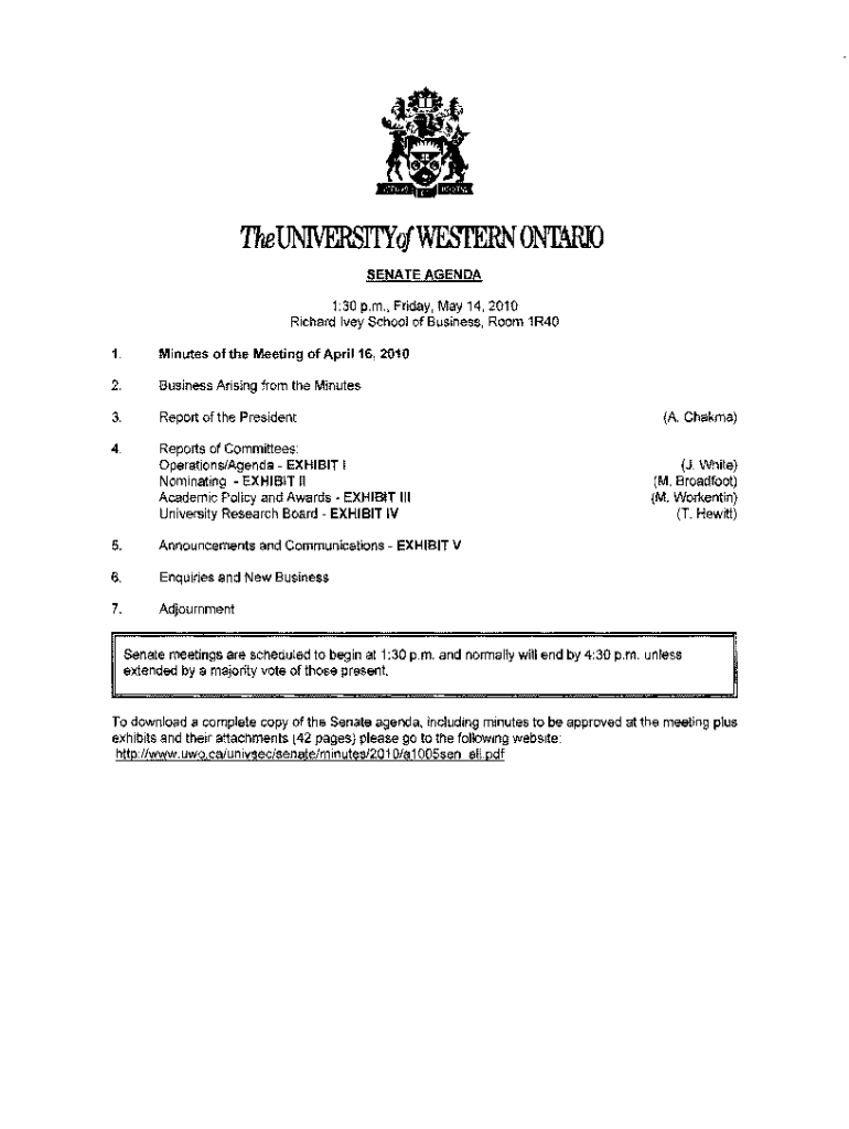 The UNIVERSITYc(WESrERN ONllRIO SENATE AGENDA 1:30 p.m., Friday, May 14, 2010Richard Ivey School of Business, Room 1R401.Minutes of the Meeting of April 16, 20102.Business Arising from the Minutes3.Report