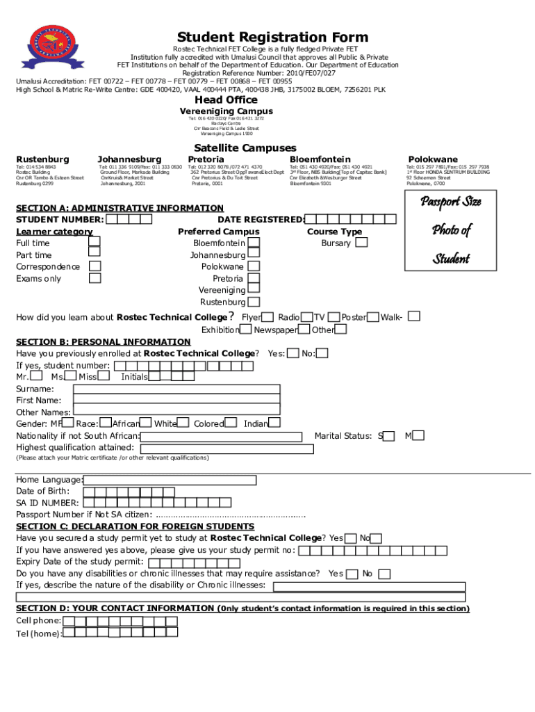 Student Registration FormRostec Technical FET College is a fully fledged Private FET Institution fully accredited with Umalusi Council that approves all Public & Private FET Institutions on behalf