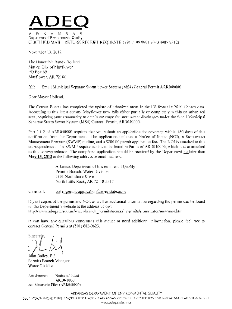 ADEQ ARKANSASDepartment of EnvronrnentalQ u a l t yCERTIFIED MAIL: RETURN RECEIPT REQUESTED (9 1 7 199 999 1 7030 4905 92 12) November 13,2012 The tlonorable Randy tlolland Mayor. City of Mayflower