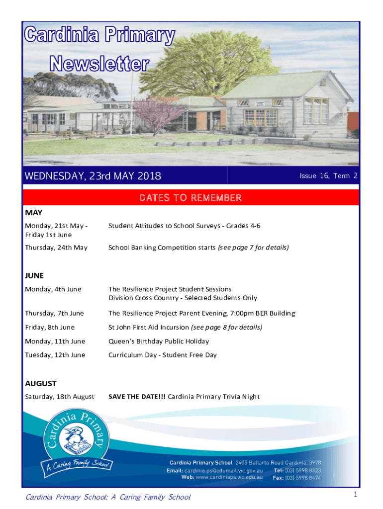 WEDNESDAY, 23rd MAY 2018Issue 16, Term 2DATES TO REMEMBER MAY Monday, 21st May Friday 1st JuneStudent Attitudes to School Surveys Grades 46Thursday, 24th MaySchool Banking Competition starts (see