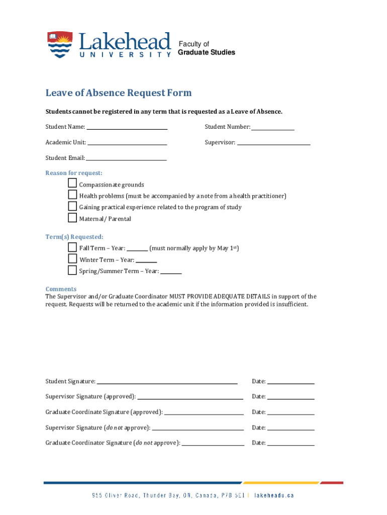 Faculty of Graduate StudiesLeave of Absence Request Form Students cannot be registered in any term that is requested as a Leave of Absence. Student Name:Academic Unit: Student Email:Student Number: