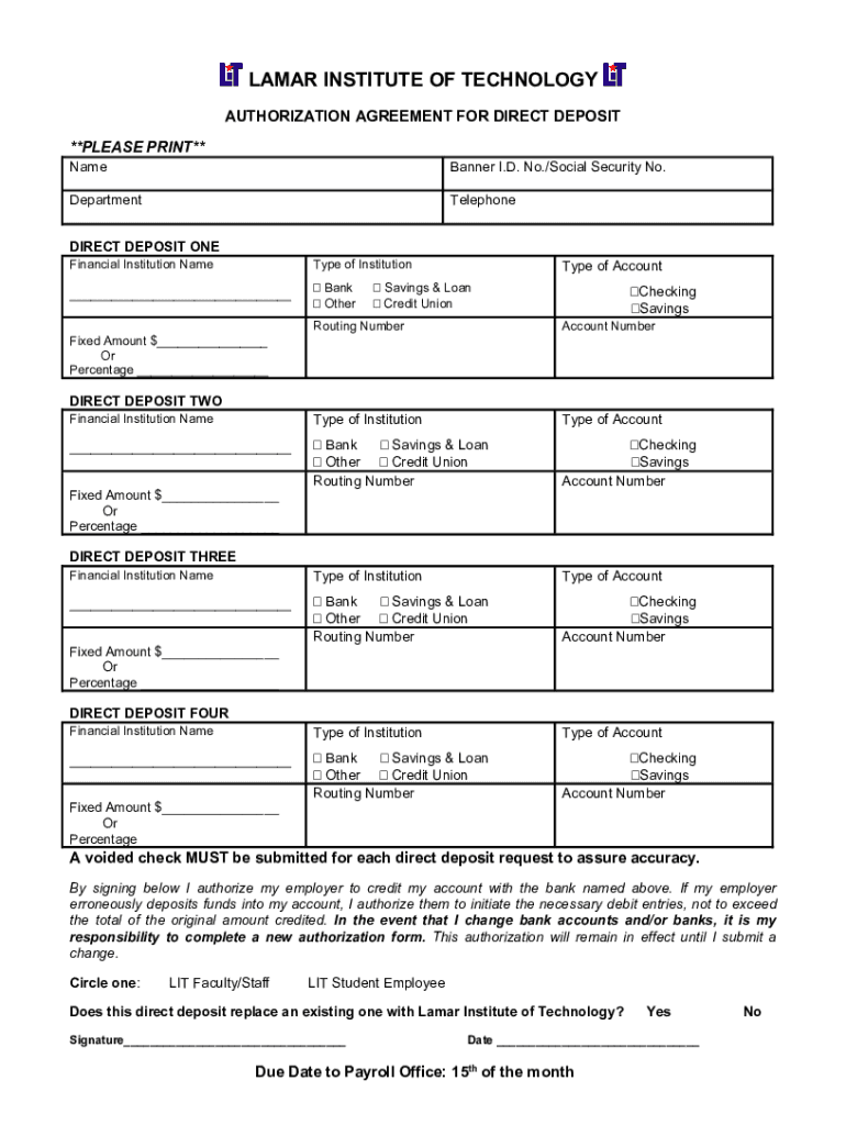 LAMAR INSTITUTE OF TECHNOLOGY AUTHORIZATION AGREEMENT FOR DIRECT DEPOSIT **PLEASE PRINT** NameBanner I.D. No./Social Security No.DepartmentTelephoneDIRECT DEPOSIT ONE Financial Institution NameType