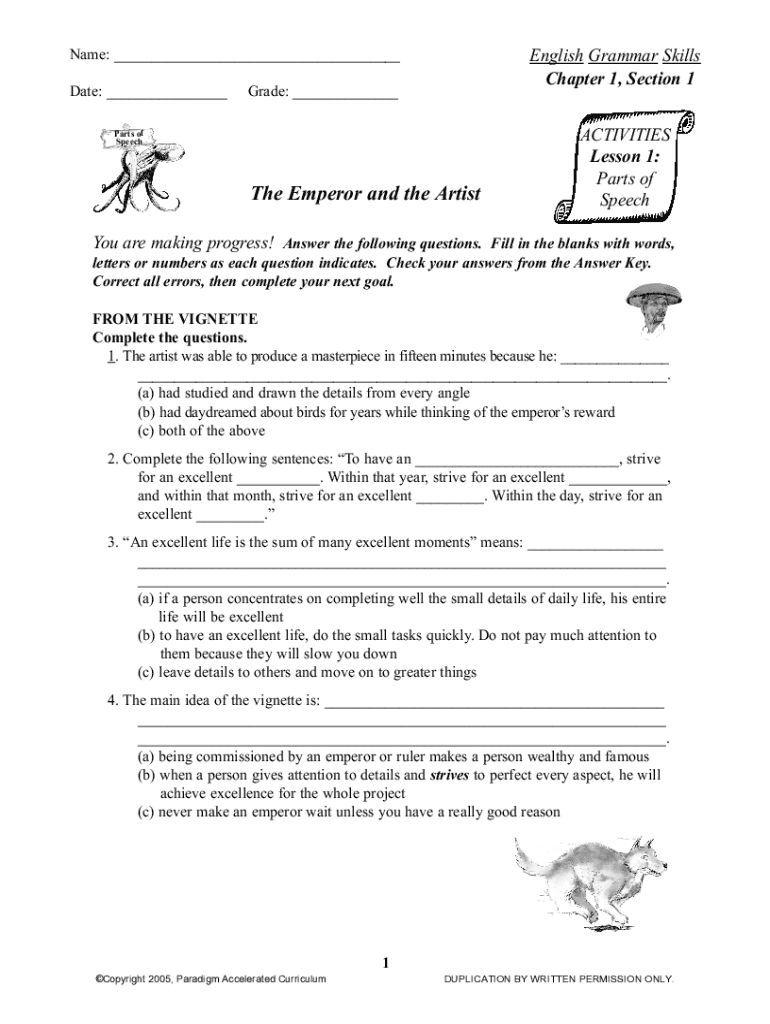 Name: ___ Date: ___English Grammar Skills Chapter 1, Section 1Grade: ___Parts of SpeechThe Emperor and the ArtistACTIVITIES Lesson 1: Parts of SpeechYou are making progress! Answer the following questions.