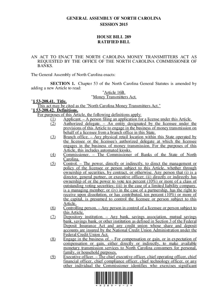 GENERAL ASSEMBLY OF NORTH CAROLINA SESSION 2015 HOUSE BILL 289 RATIFIED BILL AN ACT TO ENACT THE NORTH CAROLINA MONEY TRANSMITTERS ACT AS REQUESTED BY THE OFFICE OF THE NORTH CAROLINA COMMISSIONER