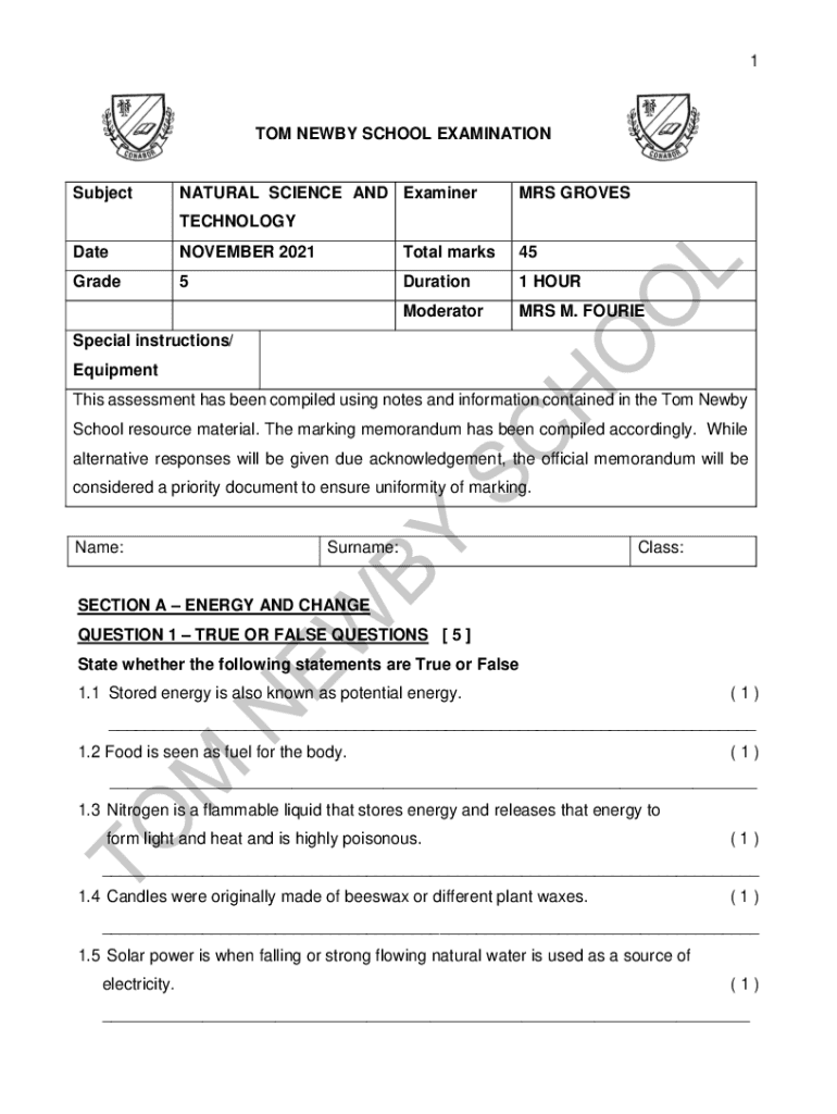 1TOM NEWBY SCHOOL EXAMINATIONSubjectNATURAL SCIENCE AND ExaminerMRS GROVESTECHNOLOGY DateNOVEMBER 2021Total marks45Grade5Duration1 HOURModeratorMRS M. FOURIESpecial instructions/ Equipment This assessment