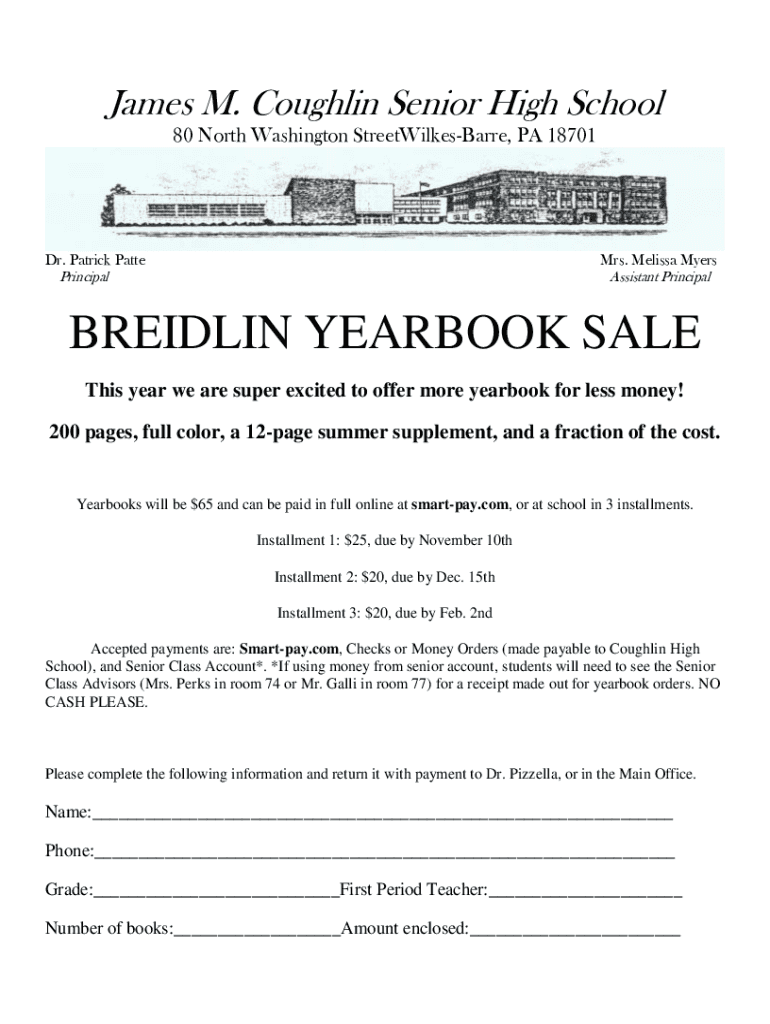 James M. Coughlin Senior High School 80 North Washington StreetWilkesBarre, PA 18701Dr. Patrick Patte PrincipalMrs. Melissa Myers Assistant PrincipalBREIDLIN YEARBOOK SALE This year we are super excited