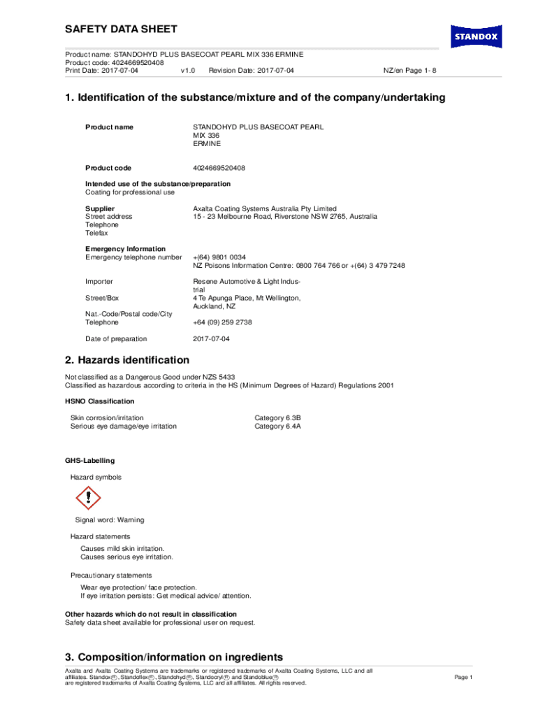 SAFETY DATA SHEET Product name: STANDOHYD PLUS BASECOAT PEARL MIX 336 ERMINE Product code: 4024669520408 Print Date: 20170704 v1.0 Revision Date: 20170704NZ/en Page 1 81. Identification of the substance/mixture