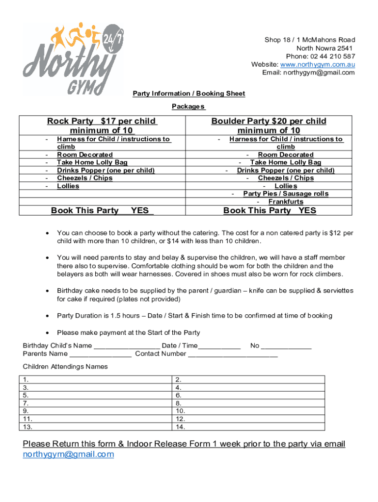 Shop 18 / 1 McMahons Road North Nowra 2541 Phone: 02 44 210 587 Website: www.northygym.com.au Email: northygym@gmail.com Party Information / Booking Sheet PackagesRock Party $17 per child minimum