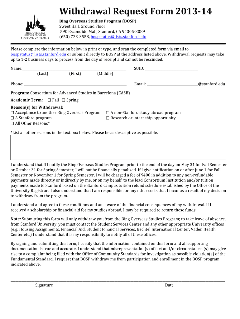 Withdrawal Request Form 2013- ?14 Bing Overseas Studies Program (BOSS) Sweet Hall, First Floor 590 Escondido Mall, Stanford, CA 94305- ?3089 (650) 723- ?3558, bospstatus lists.Stanford.edu Please