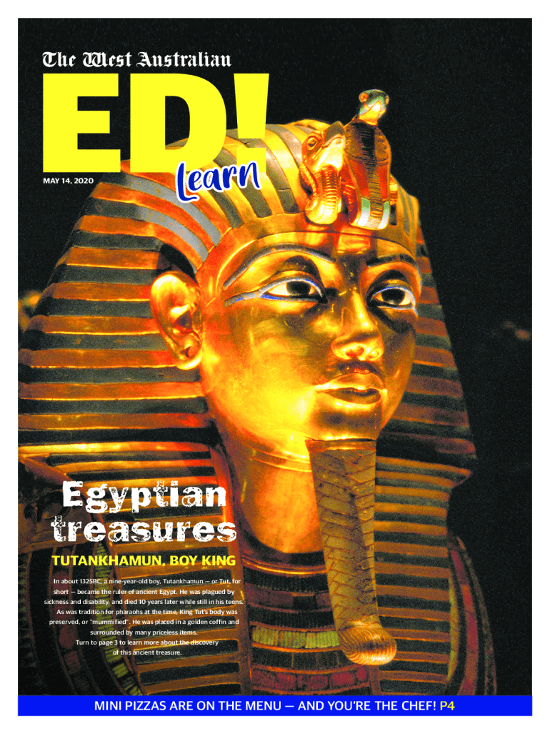 ED! MAY 14, 2020Egyptian treasures TUTANKHAMUN, BOY KINGIn about 1325BC, a nineyearold boy, Tutankhamun or Tut, for short became the ruler of ancient Egypt. He was plagued by sickness and disability,