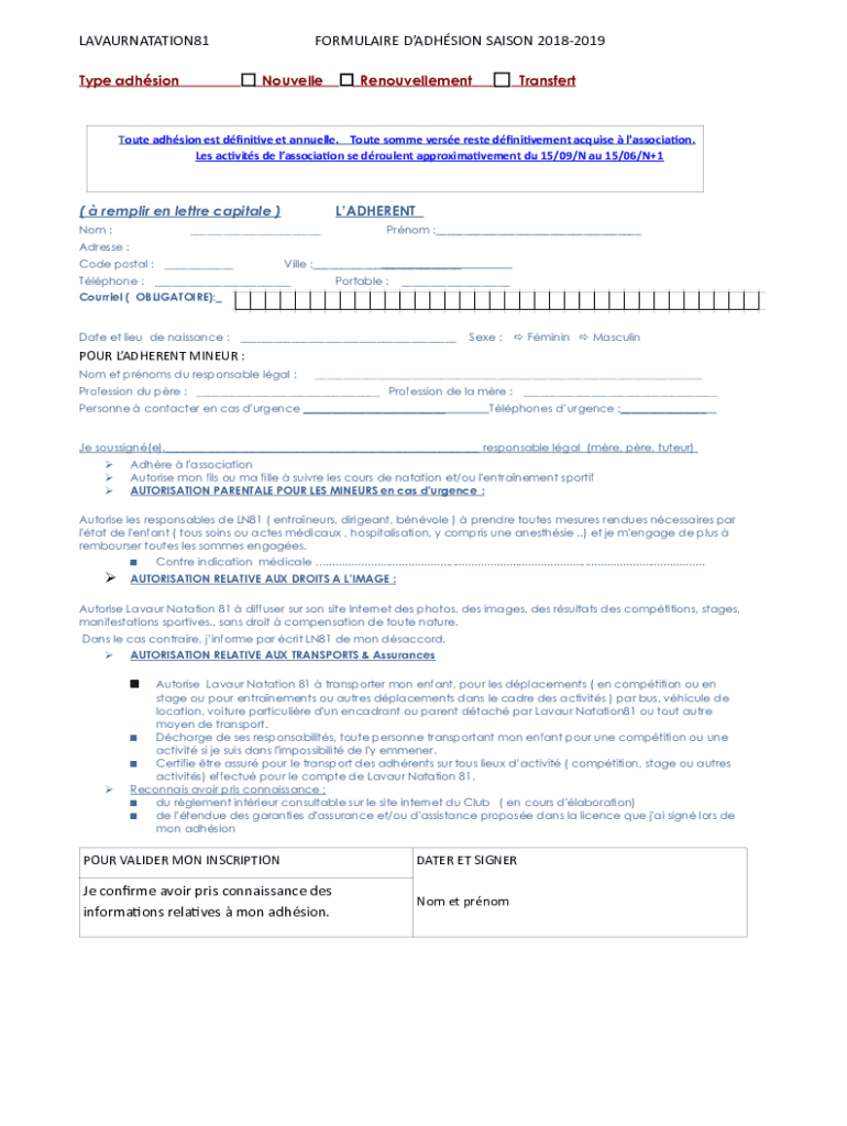 LAVAURNATATION81 Type adhsionFORMULAIRE DADHSION SAISON 20182019 NouvelleRenouvellementTransfertToute adhsion est dfinitive et annuelle. Toute somme verse reste dfinitivement acquise l\'association.