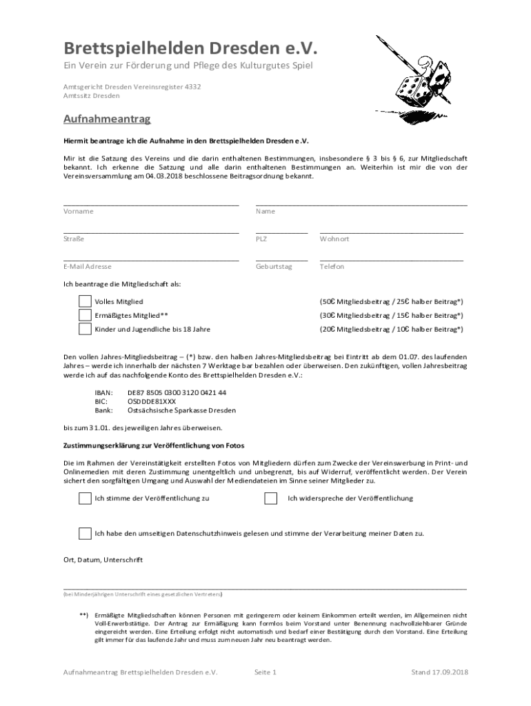 Brettspielhelden Dresden e.V. Ein Verein zur Frderung und Pflege des Kulturgutes Spiel Amtsgericht Dresden Vereinsregister 4332 Amtssitz DresdenAufnahmeantrag Hiermit beantrage ich die Aufnahme in