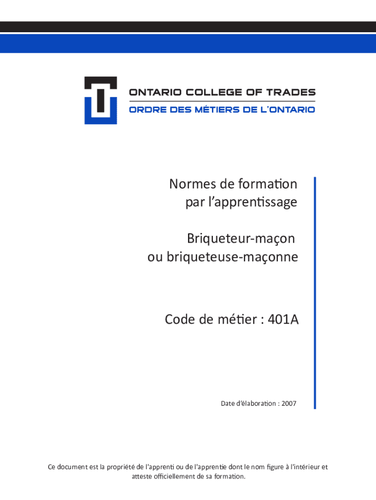 Normes de formation par lapprentissage Briqueteurmaon ou briqueteusemaonneCode de mtier : 401ADate dlaboration : 2007Ce document est la proprit de l\'apprenti ou de l\'apprentie dont le nom gure l\'intrieur