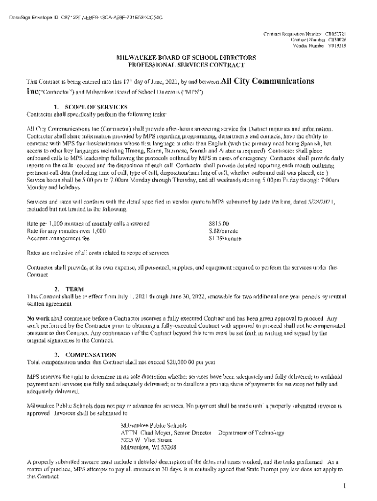 DocuSIgn Envelope ID C87122F7EBF943CAA59F731 E534CC54CConllact Requ1s1hon Numbe1 CR052721 Contiact Numbe1 C030026 Vendm Numbe1 V0l95l9MILWAUKEE BOARD OF SCHOOL DIRECTORS PROFESSIONAL SERVICES CONTRACT