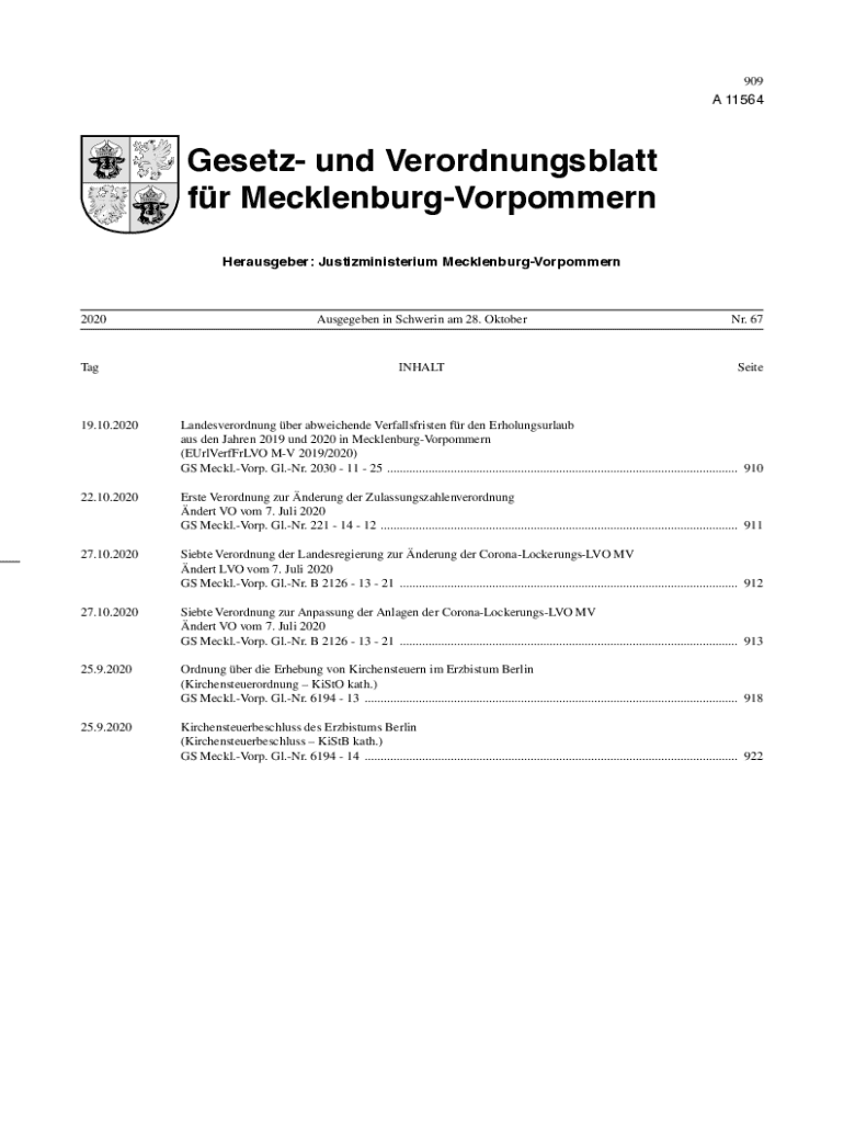 909A 11564Gesetz und Verordnungsblatt fr MecklenburgVorpommern Herausgeber: Justizministerium MecklenburgVorpommern2020Ausgegeben in Schwerin am 28. OktoberNr. 67TagINHALTSeite19.10.2020Landesverordnung