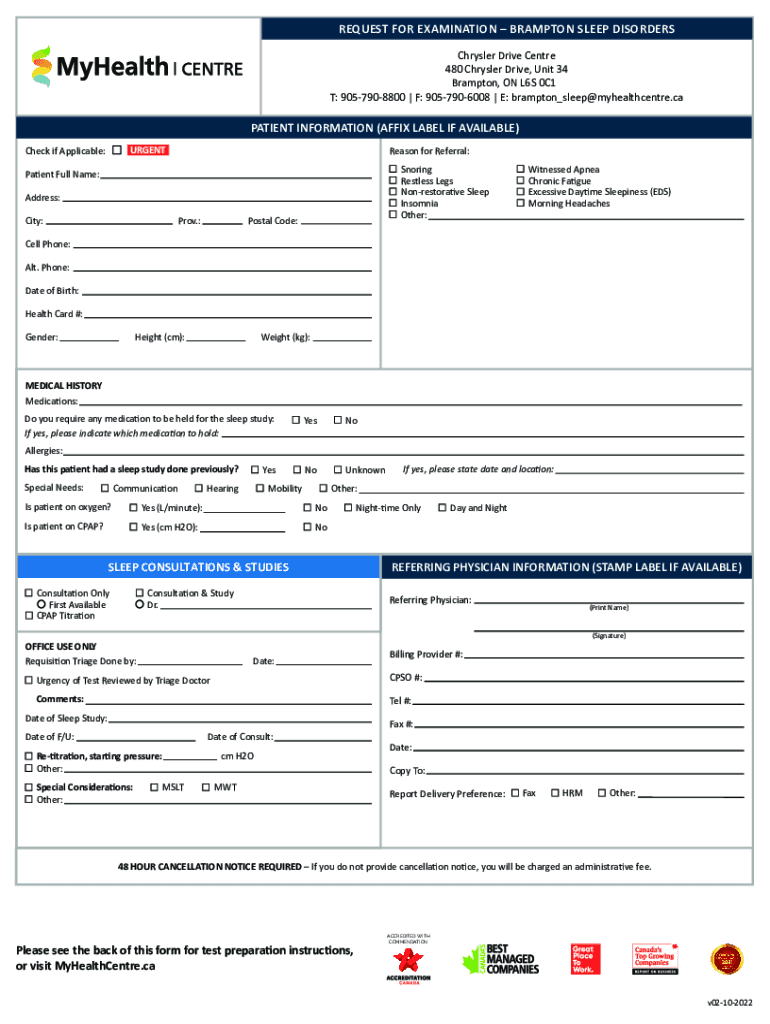REQUEST FOR EXAMINATION BRAMPTON SLEEP DISORDERS Chrysler Drive Centre 480 Chrysler Drive, Unit 34 Brampton, ON L6S 0C1 T: 9057908800 | F: 9057906008 | E: brampton_sleep@myhealthcentre.caPATIENT INFORMATION