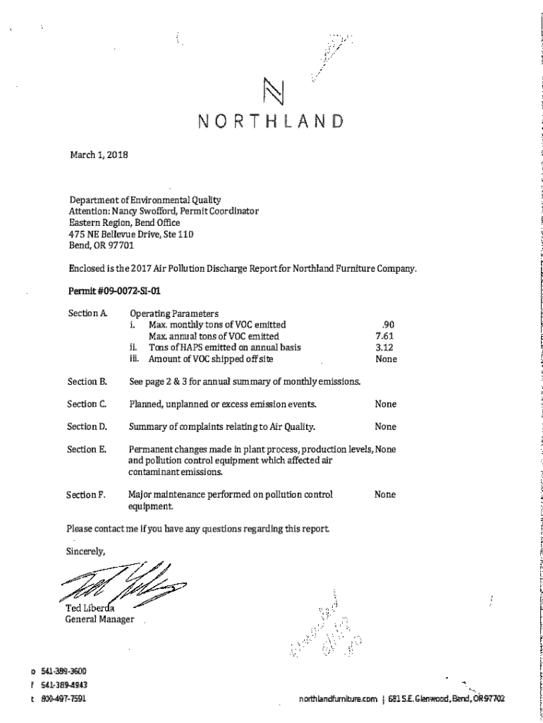 NORTHLAND March 1, 2018Department of Environmental Quality Attention: Nancy Swofford, Permit Coordinator Eastern Region, Bend Office 475 NE Bellevue Drive, Ste 110 Bend, OR 97701 Enclosed is the 2017