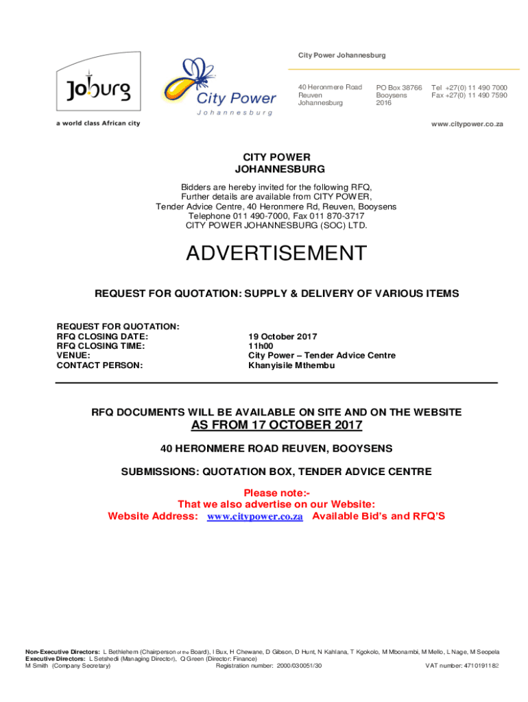 City Power Johannesburg40 Heronmere Road Reuven JohannesburgPO Box 38766 Booysens 2016Tel +27(0) 11 490 7000 Fax +27(0) 11 490 7590www.citypower.co.zaCITY POWER JOHANNESBURG Bidders are hereby invited