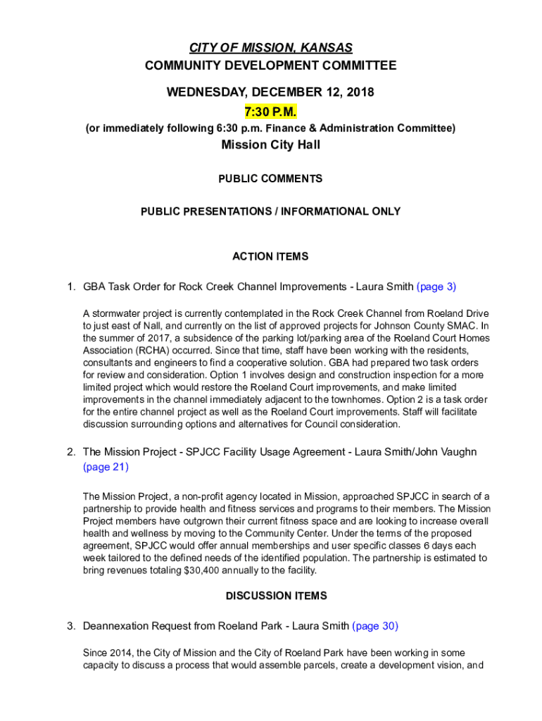 CITY OF MISSION, KANSAS COMMUNITY DEVELOPMENT COMMITTEE WEDNESDAY, DECEMBER 12, 2018 7:30 P.M. (or immediately following 6:30 p.m. Finance & Administration Committee)Mission City Hall PUBLIC COMMENTS