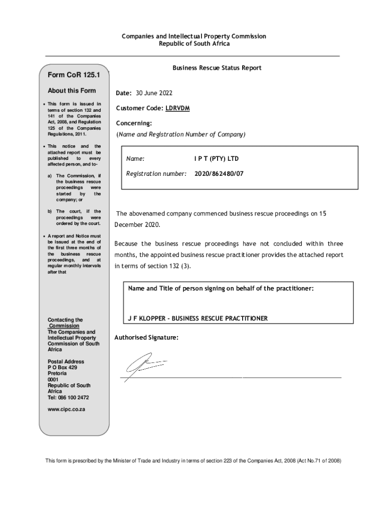 Companies and Intellectual Property Commission Republic of South Africa___ Business Rescue Status ReportForm CoR 125.1 About this Form This form is issued in terms of section 132 and 141 of the Companies